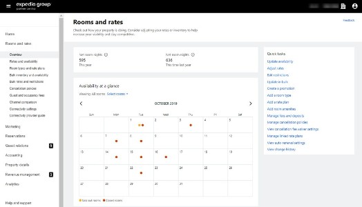 - New "Rooms and Rates" overview page – the simplified view streamlines information and tasks related to rooms, rates and inventory. The new page reduces the number of links and helps suppliers determine where to take action with business alerts and high-level insights.