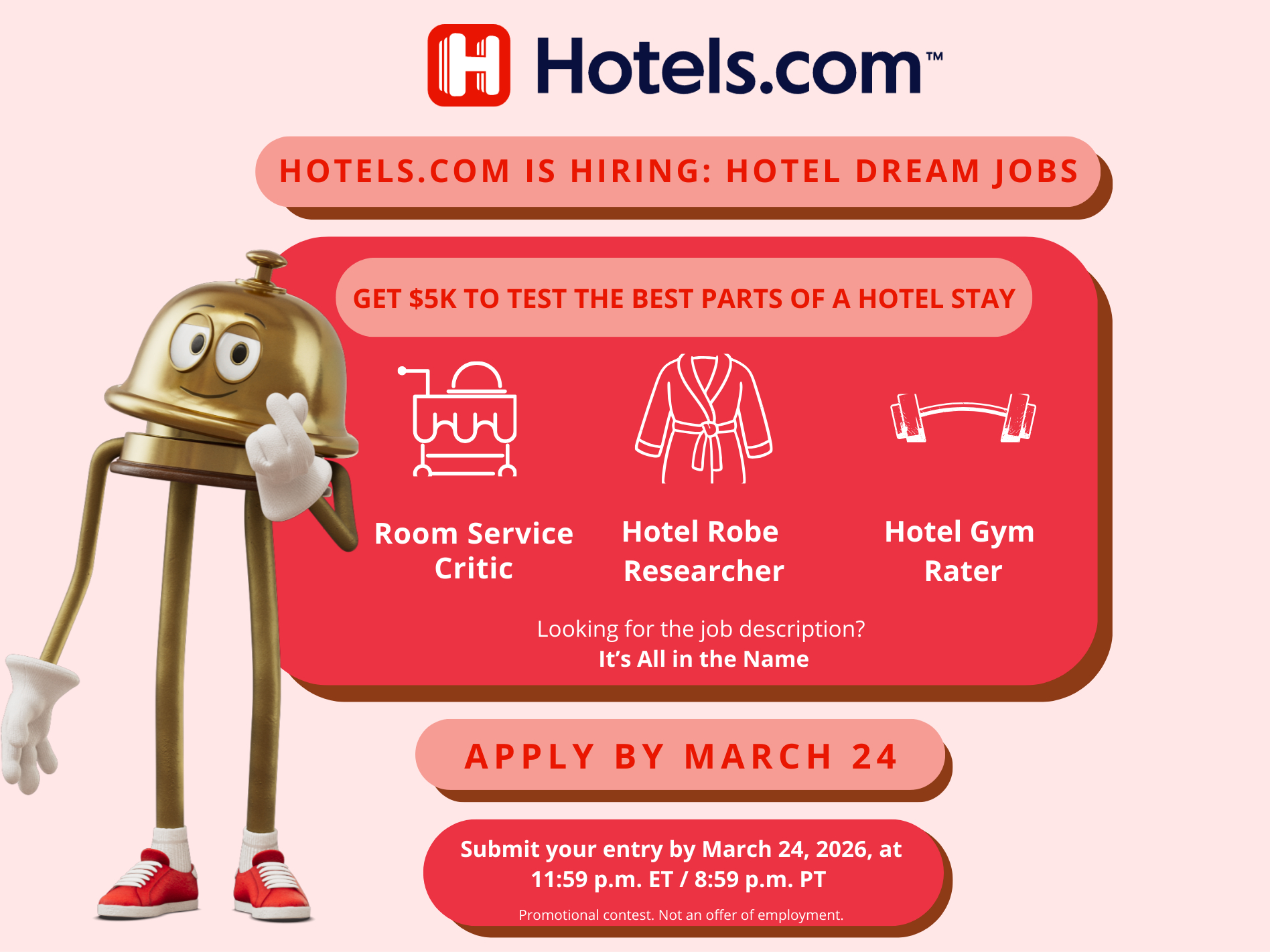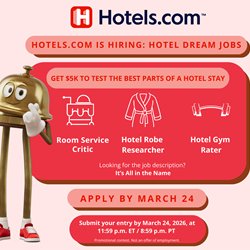 NO PURCHASE NECESSARY. A PURCHASE WILL NOT INCREASE YOUR CHANCES OF WINNING. LEGAL RESIDENTS OF THE UNITED STATES AT LEAST 21+ YEARS OLD. VOID WHERE PROHIBITED. CONTEST BEGINS 3/17/2026 AND ENDS 3/24/2026. FOR OFFICIAL RULES, PRIZE DESCRIPTIONS AND ODDS DISCLOSURE, VISIT https://www.expedia.com/newsroom/hotels-com-launches-search-for-a-room-service-critic-robe-researcher-and-hotel-gym-rater/ SPONSOR:Expedia, Inc., 1111 Expedia Group Way W., Seattle, WA 98119.